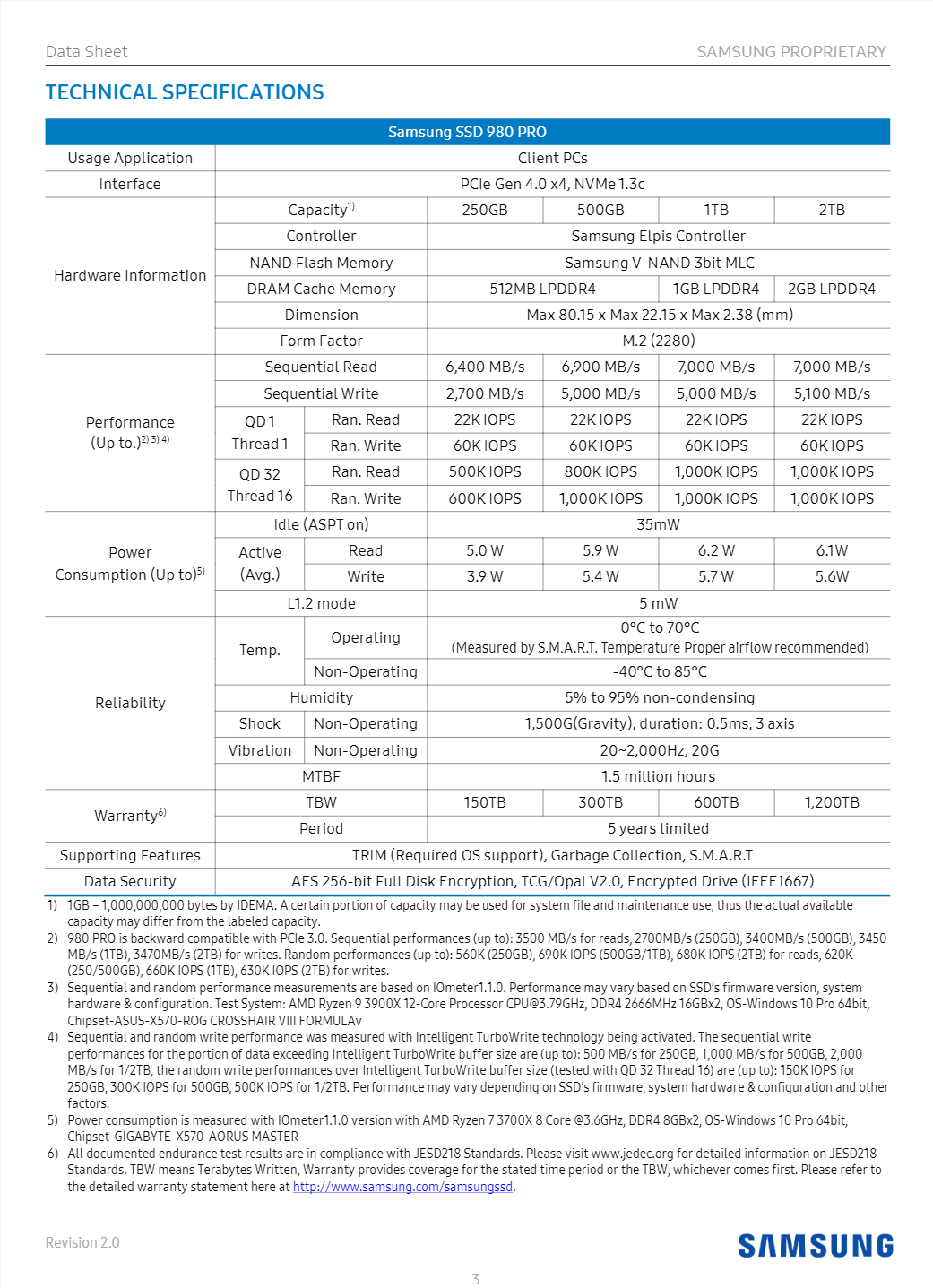 The 980 Pro is built on a black PCB (printed circuit board) which contains Samsung’s newest Elpis Gen 4 NVMe controller, a Samsung 2GB LPDDR4 DRAM chip, along with two 1TB pieces of Samsung’s latest 6th Generation 3-bit 3D TLC V-NAND. The 980 Pro has AES 256-bit full disk encryption and this is a one-sided SSD. With respect to security, it is also accredited TCG/Opal V.20 Encrypted Drive.