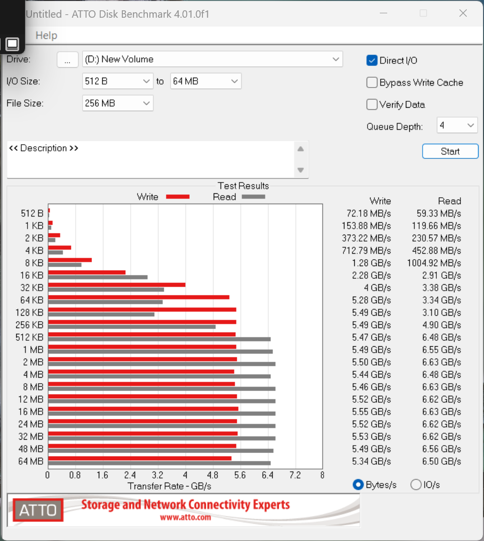 ATTO performance hits highs of 6.63GB/s read and 5.49GB/s write are excellent results for this SSD.