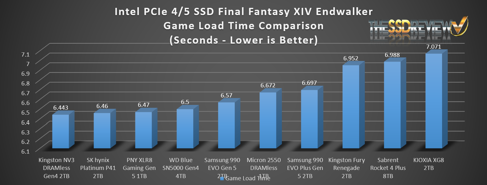 The Samsung 990 EVO Plus SSD completed this test with a low game loading time of 6.697 seconds which is decent considering the company it keeps. Its placement over all SSDs is 20th, with less than 2 seconds difference between this SSD and the top SSD.