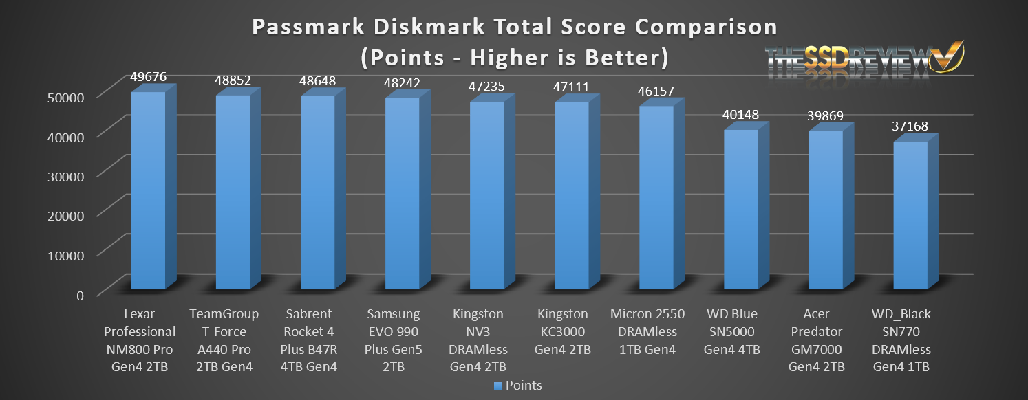 The Samsung 990 EVO Plus placed 22nd in SSDs tested to date on the Passmark Diskmark software. This chart identifies SSDs with similar results as the 990 EVO Plus.
