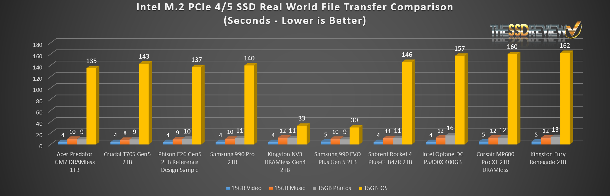 The Samsung 990 EVO Plus 2TB SSD placed 16th in all SSDs tested to date for our Real World Data testing. This chart again does not identify the top candidates, but rather, those comparable to the EVO Plus. Particularly impressive with respective to this SSD is the speed in which it moves those small OS files.