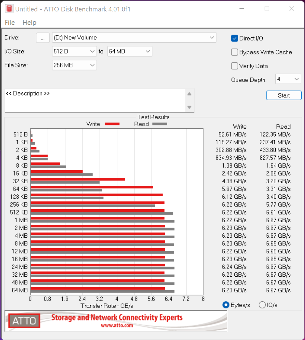 ATTO performance hits highs of 6.67GB/s read and 6.23GB/s write are as good as it gets for a Gen4 SSD. Very encouraging as well is the fact that performance consistently rises as data sizes increase. We have always found this to be the trademark of a solid SSD.