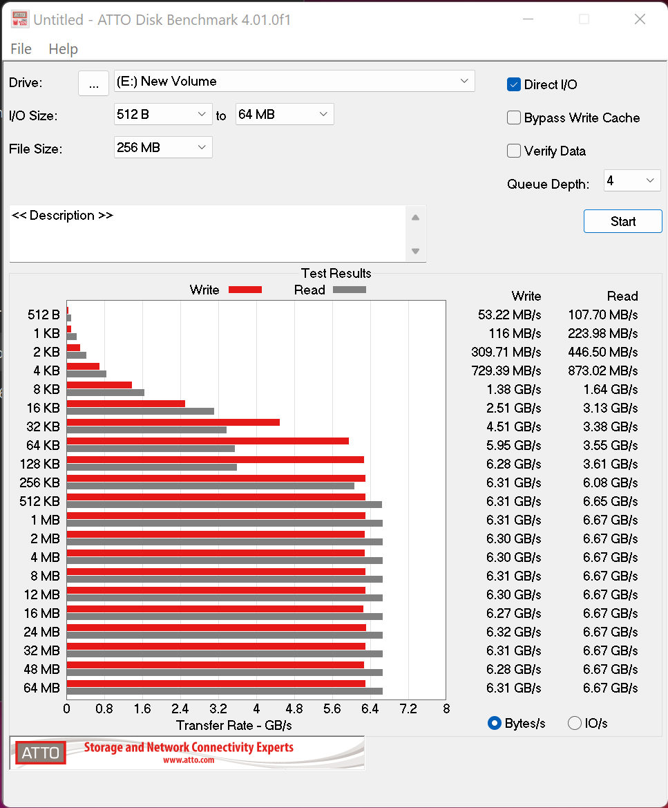 ATTO performance hits highs of 6.67 GB/s read and 6.31 GB/s write are as good as it gets. It is also nice to see solid and consistent data throughput progression as sample sizes increased. We think this might just be the best we have seen yet from a Gen 4 M.2 SSD.