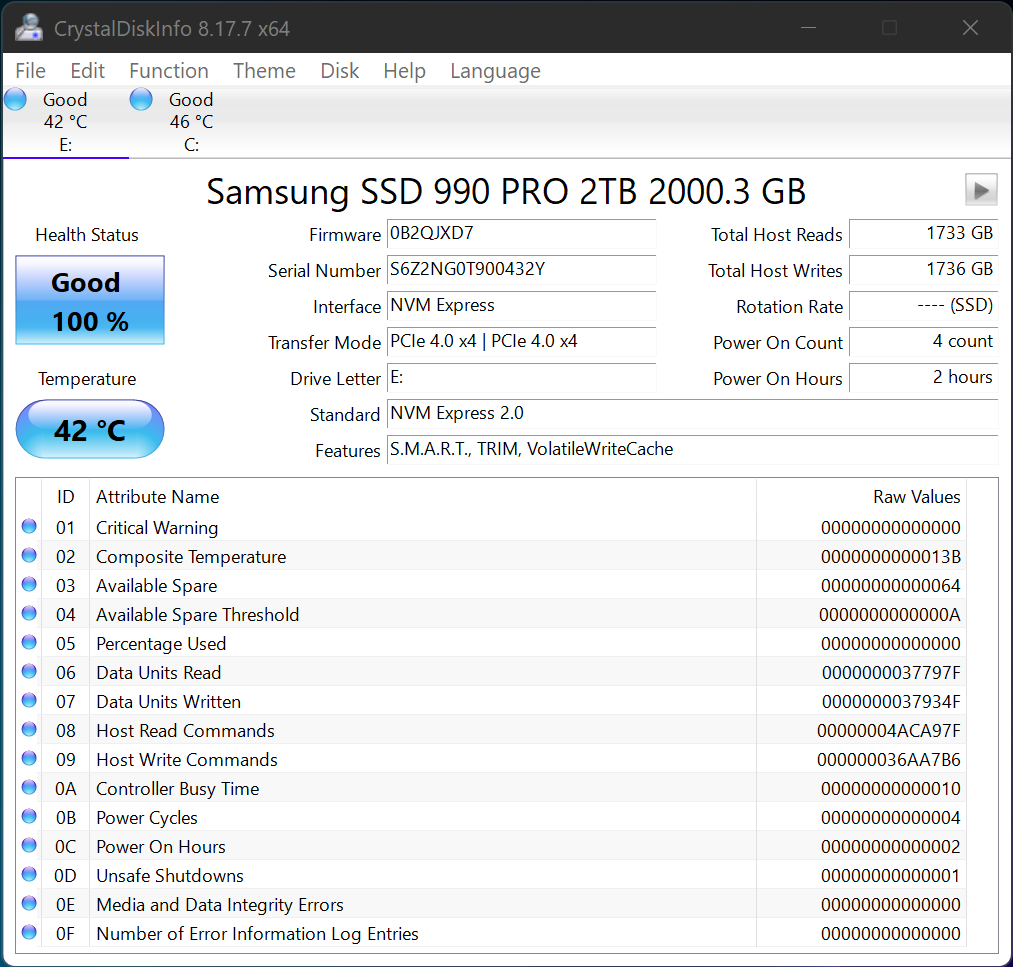 Crystal DiskInfo validates that our SSD is running in PCIe 4.0 x4, using the NVMe 2.0 protocol and confirms that it is TRIM capable. 42°C is the hottest we could push this SSD with the heatsink attached. Without the heatsink, surprisingly its highest temperature was 67°C.