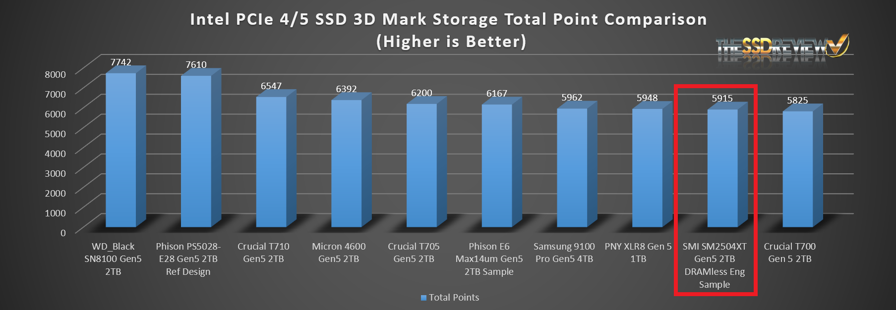 The SMI SM2504XT placed niinth of all SSDs tested to date on 3DMark Storage Benchmark.