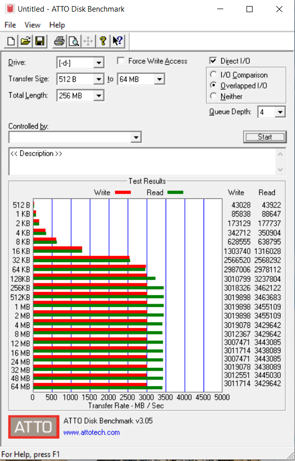 ATTO Disk Benchmark is perhaps one of the oldest benchmarks going and is definitely the main staple for manufacturer performance specifications. ATTO uses RAW or compressible data and, for our benchmarks, we use a set length of 256mb and test both the read and write performance of various transfer sizes ranging from 0.5 to 8192kb. Manufacturers prefer this method of testing as it deals with raw (compressible) data rather than random (includes incompressible data) which, although more realistic, results in lower performance results.