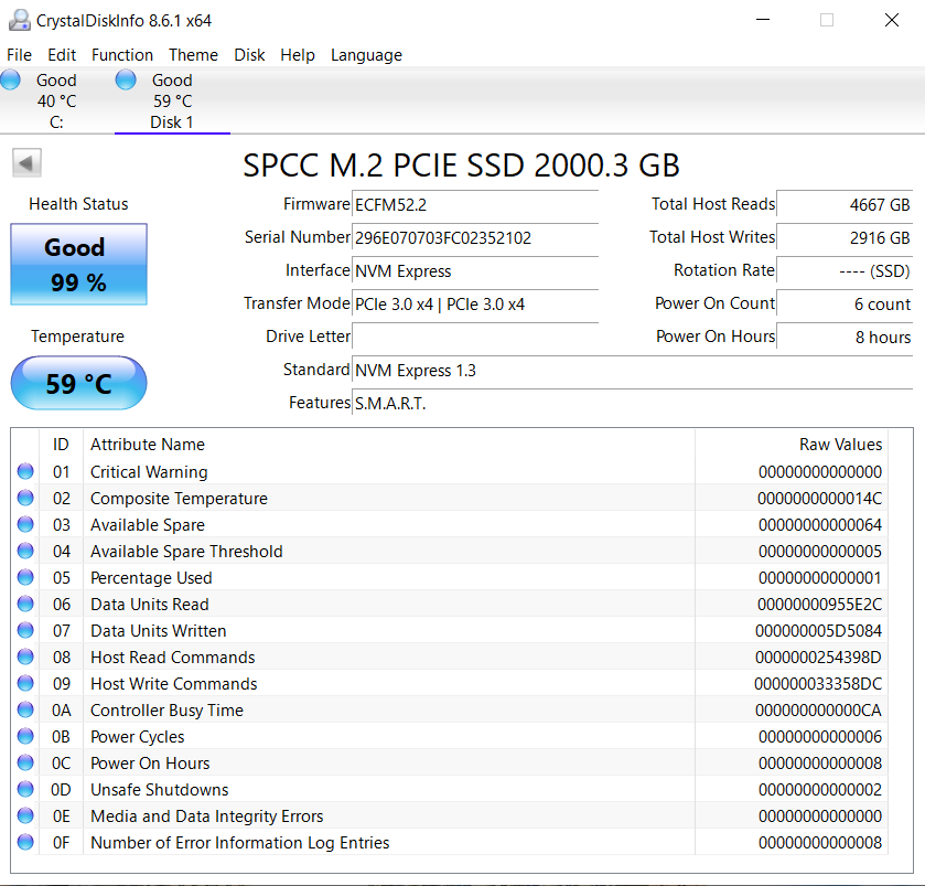 Crystal Disk Info is a great tool for displaying the characteristics and health of storage devices. It displays everything from temperatures, the number of hours the device has been powered, and even to the extent of informing you of the firmware of the device.