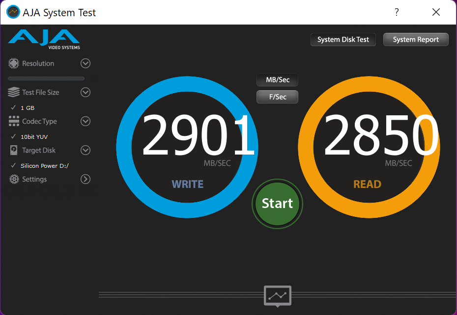 The AJA Video Systems Disk Test is relatively new to our testing and tests the transfer speed of video files with different resolutions and Codec.