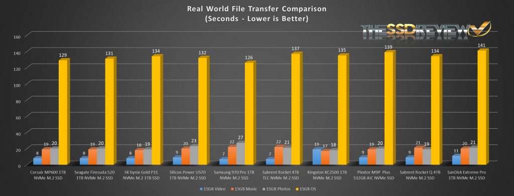 We have put the SK hynix Gold P31 NVMe SSD beside the best in the business for our true to life data testing. In this test, we simply place 15GB files representing music, video, pictures and operating systems onto the target drive. We then copy each file from one place on the target disk to another, recording the time taken for the transfer.