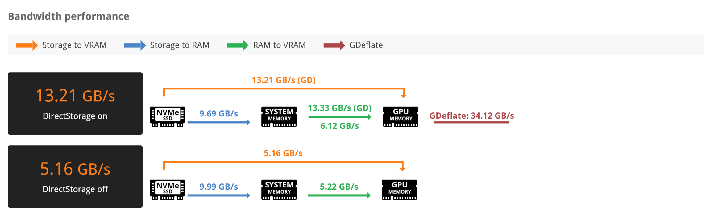 In our testing, data transfer achieved a 156% faster transfer of data than with MS DirectStorage disabled.