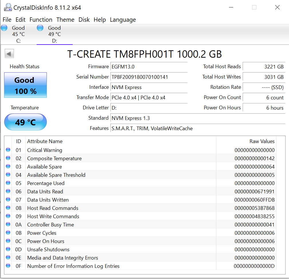 Crystal DiskInfo validates that we are running in Gen 4×4 mode and, as well, that we are running in the NVMe 1.3 protocol