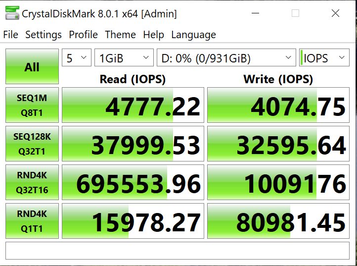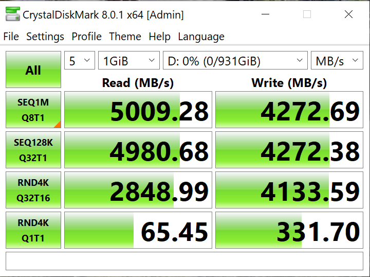 ATTO provides solid results as can be seen by the steady progression of performance as sample sizes progress. Although we can see that specifications are met in write results above 5GB/s, read performance is a bit low at 4GB/s; spec being 4.4GB/s.