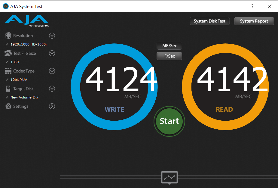 The AJA Video Systems Disk Test is relatively new to our testing and tests the transfer speed of video files with different resolutions and Codec.