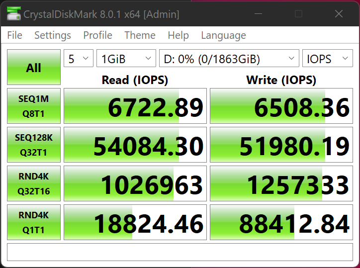 Crystal DiskMark results are very strong with over 7GB/s throughput and 1 million IOPS.