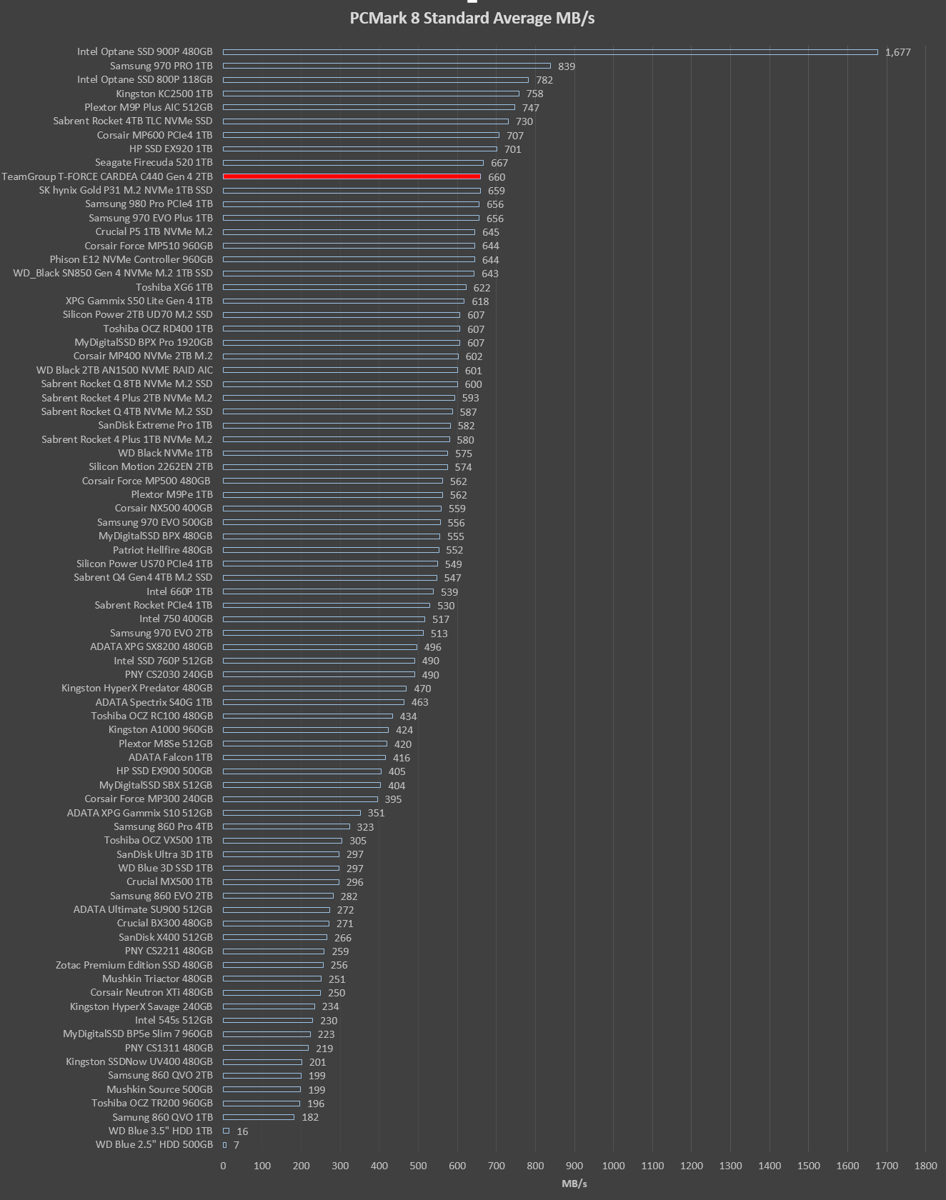 The T-FORCE CARDEA C440 did rather well with PCMark 8, beating out a number of Gen 4 competitors by a healthy margin, this being the result of a solid processor and Kioxia NAND.