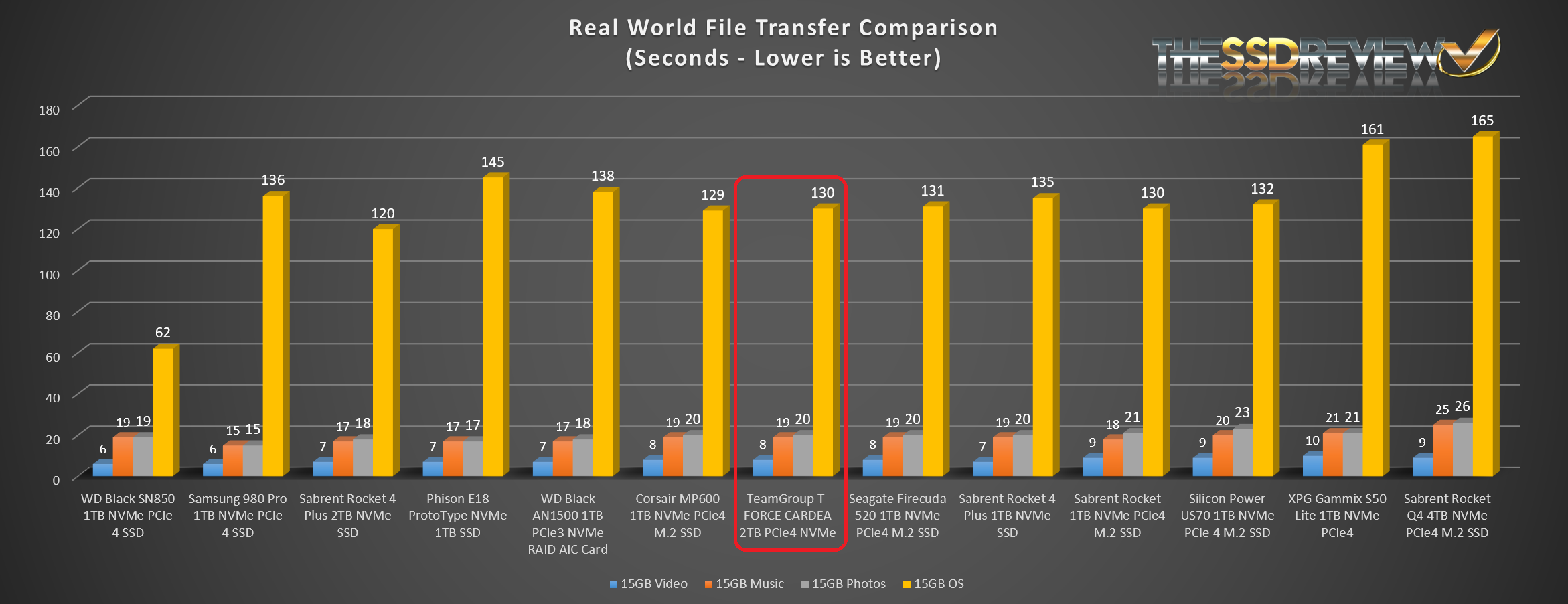 For our Real World File Transfer Comparison of the world’s top M.2 NVMe SSDs, we have included several of the top Gen 4 SSDs tested to date to see exactly where they place beside the T-FORCE CARDEA C440. This test is conducted through the transfer of data from one spot on the test drive to another to give us the truest of transfer speed results for that device.