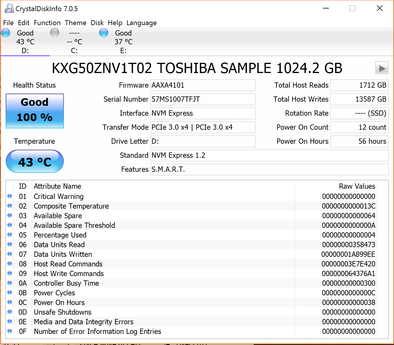 Crystal Disk Info is a great tool for displaying the characteristics and health of storage devices. It displays everything from temperatures, the number of hours the device has been powered, and even to the extent of informing you of the firmware of the device.
