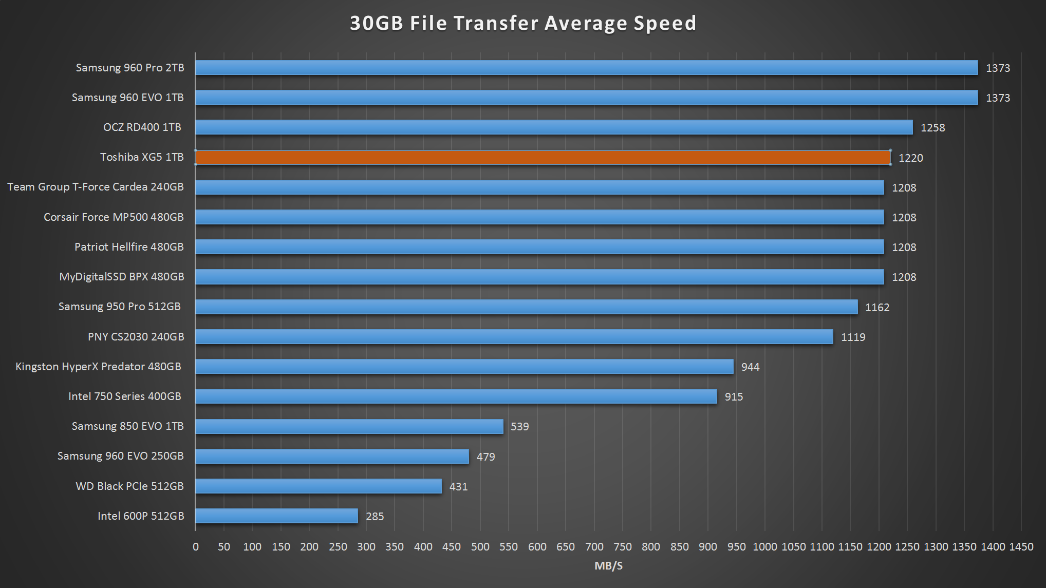 Once again, the Toshiba XG5 is among the best with an average speed of 1.2GB/s during a real world file transfer of a 30GB video folder.