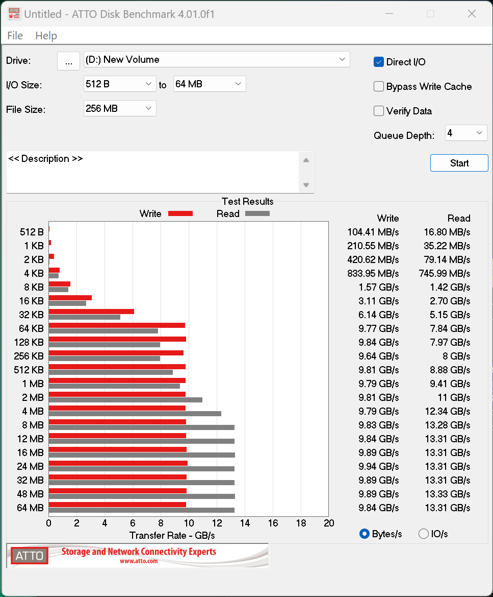 ATTO performance hits highs of 13.33GB/s read and 9.89GB/write which is just a bit below listed specs as is the norm for ATTO.