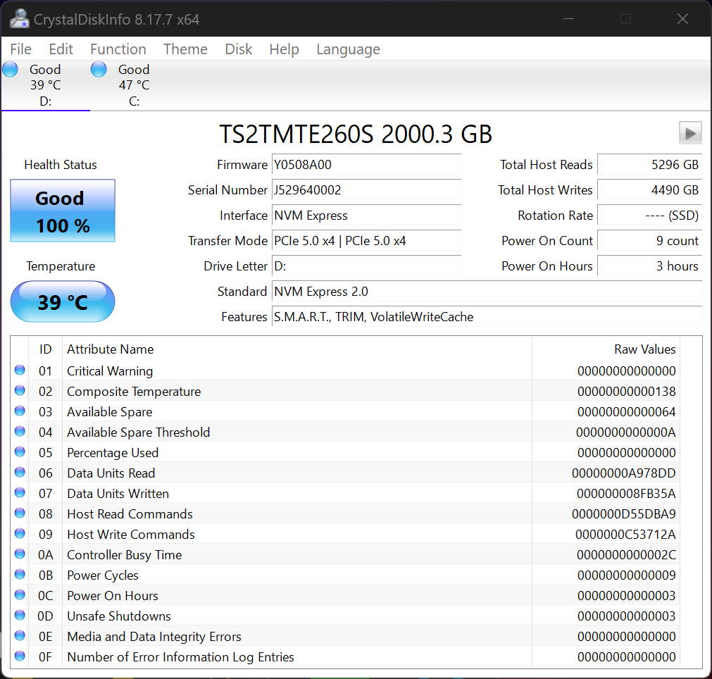 Crystal DiskInfo validates that our SSD is running in PCIe 5.0 x4, using the NVMe 2.0 protocol and confirms that it is TRIM capable.