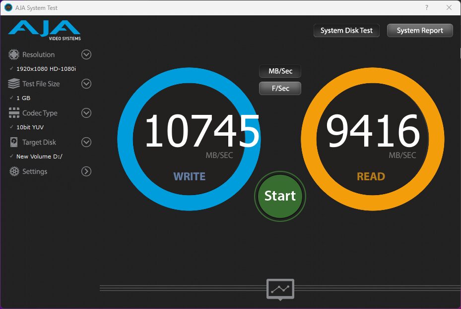 The AJA Video Systems Disk Test is relatively new to our testing and tests the transfer speed of video files with different resolutions and Codec.