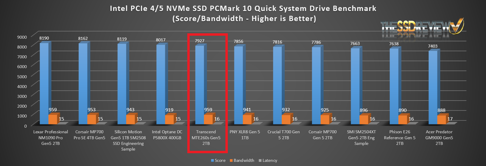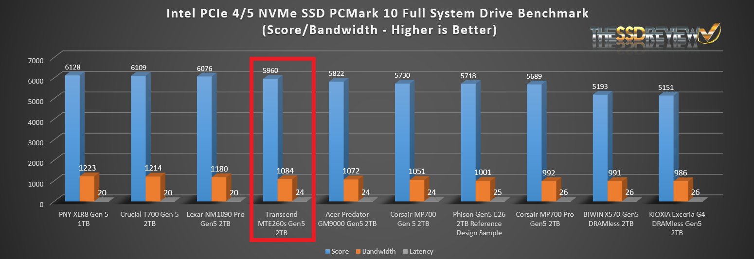 The Transcend MTE260S returned upper mid-level performance results in this test. We can also validate that the SSDs on either side of the MTE260S both contain that same SMI SM2508 controller.
