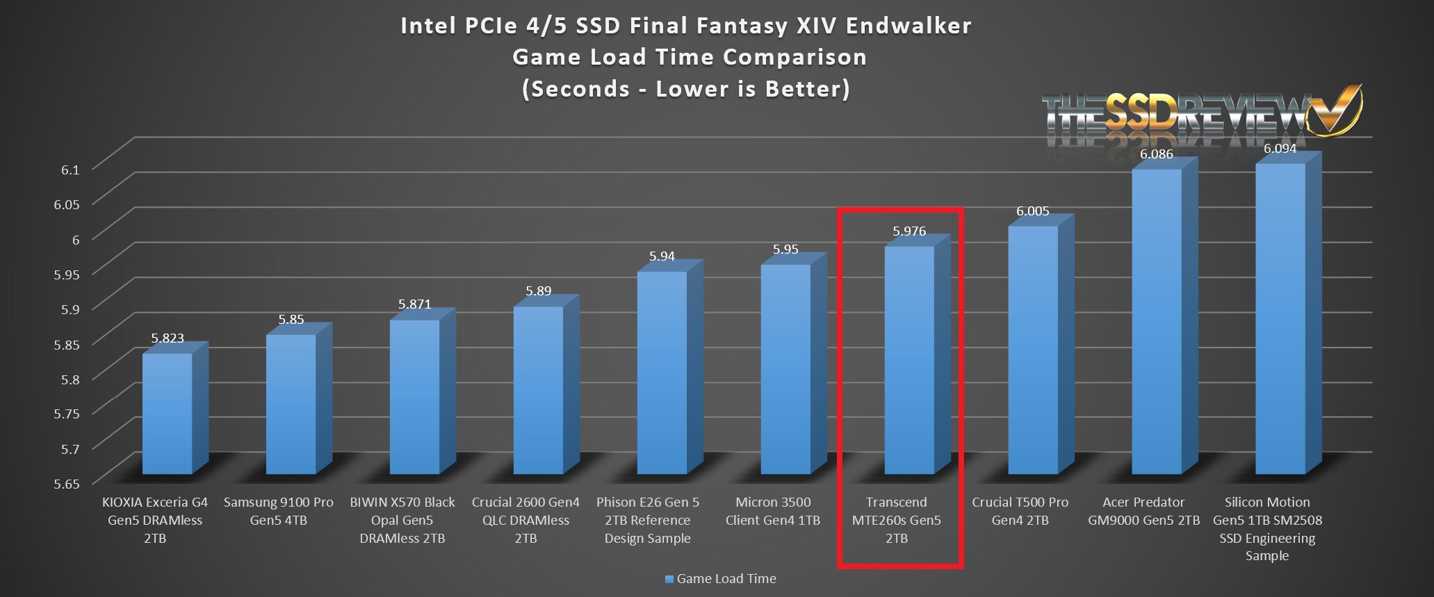 Game load time testing for the Transcend MTE260S Gen5 SSD came in at 5.976 seconds, once again midrange but keeping in mind the difference in these comparison results being measured in a fraction of a second.