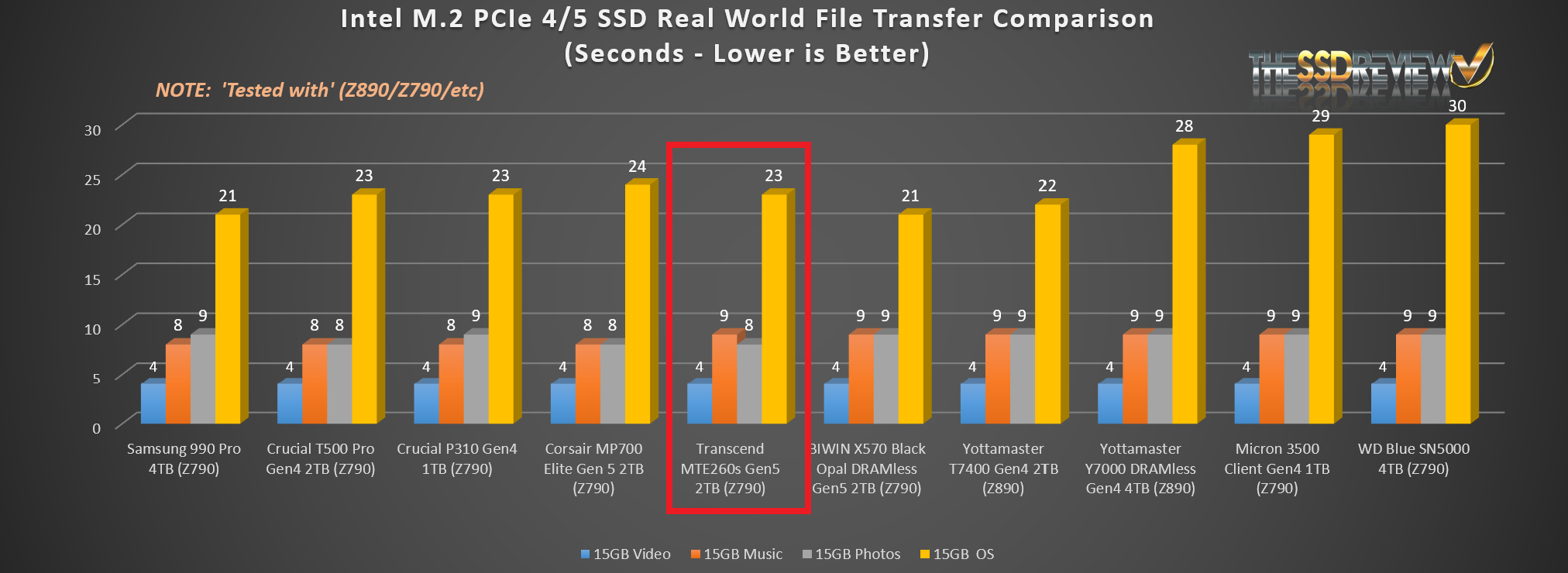 For our True Data Testing, we simply loaded 15GB video, music, photo and OS files onto the Transcend MTE260S Gen5 2TB SSD and copied the data to a new folder on that same disk.