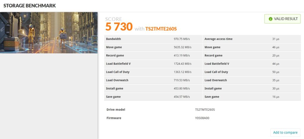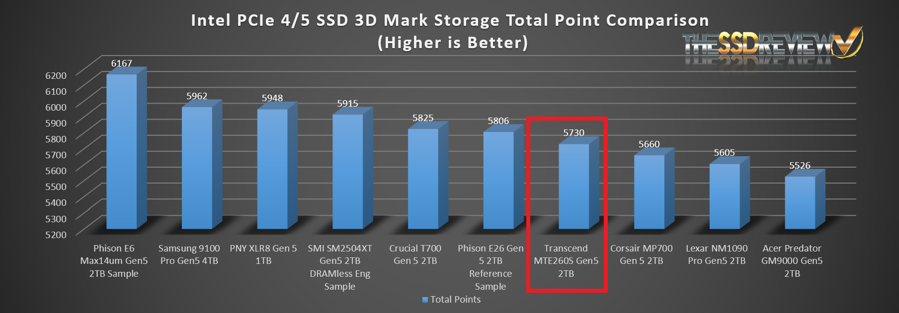 The Transcend MTE260S placed twelfth of all SSDs tested to date on 3DMark Storage Benchmark.