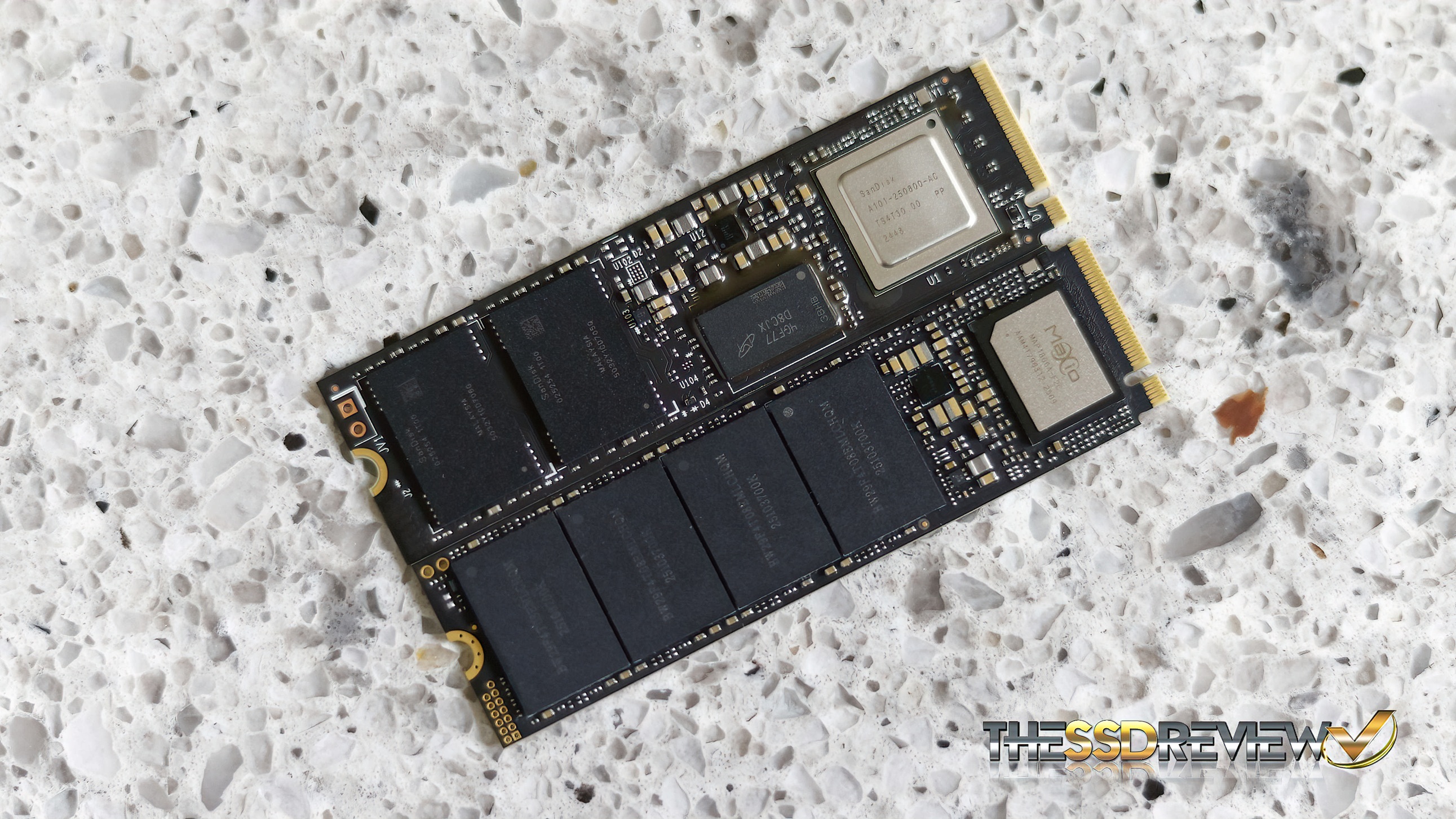The SanDisk WD_Black SN8100 Gen5 SSD contains a SanDisk branded SMI SM2508 8-channel NVMe SSD controller and two pieces of SanDisk BiCS 8 218-layer CBA 3D TLC NAND flash memory, each piece having a RAW value of 1TB before formatting.