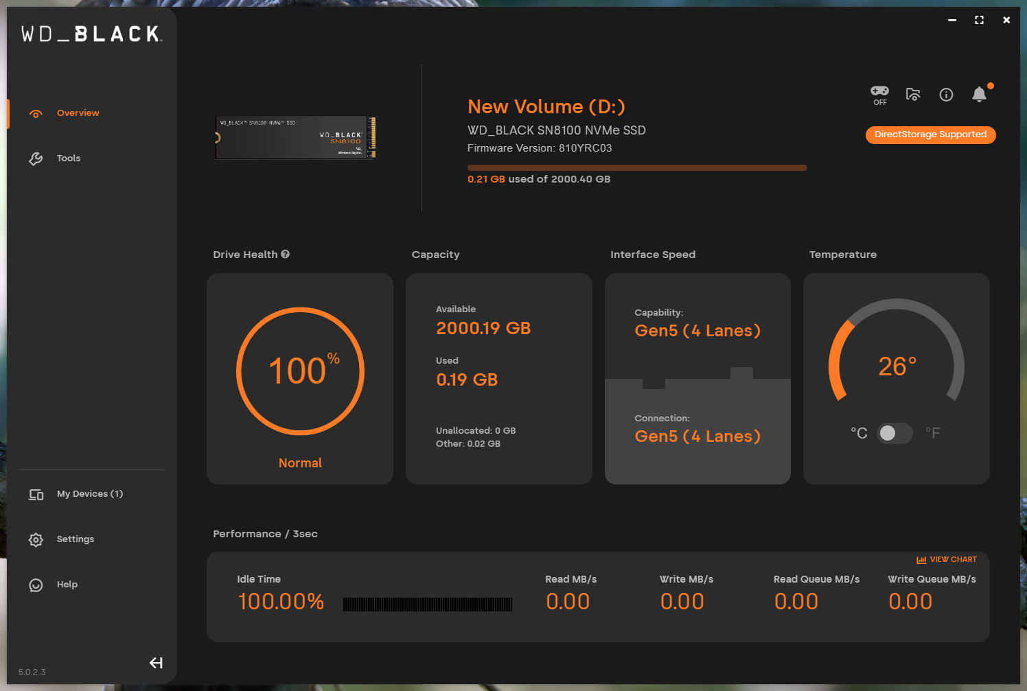 The Western Digital/SanDisk SSD Dashboard has been discontinued but the final version works perfectly with the SN8100. It can be downloaded from this link. It is actually a very useful Dashboard as the Tools page enables such things as firmware update, creating a USB for Secure Drive, downloading Acronis proprietary migration software, running and enabling TRIM, as well as running SMART diagnostics checks.