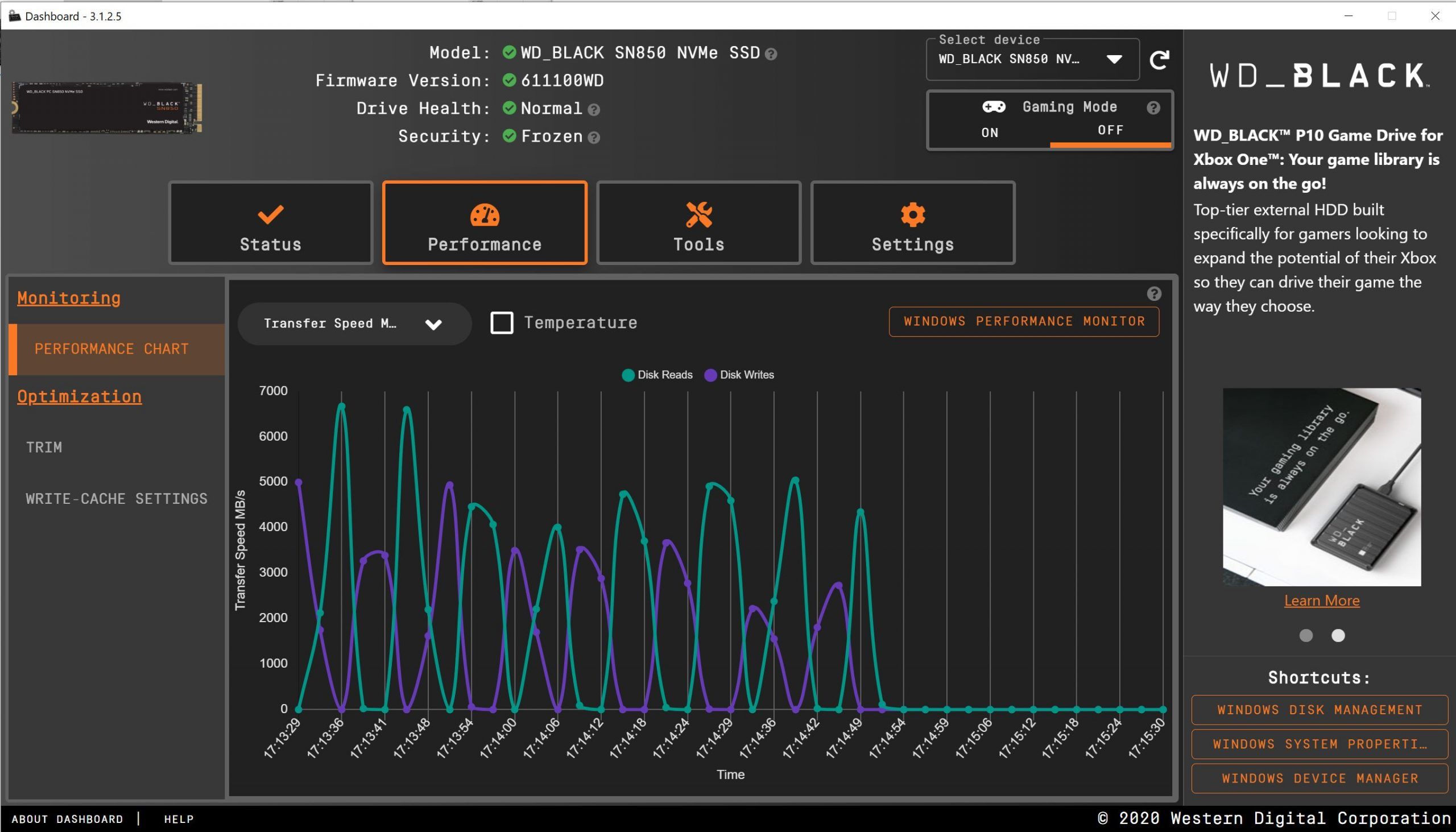 This is the WD Dashboard, which is probably one of the most complete SSD tool kits available today. Under the performance, it uses Windows Performance Monitor to monitor SSD speeds in real time.