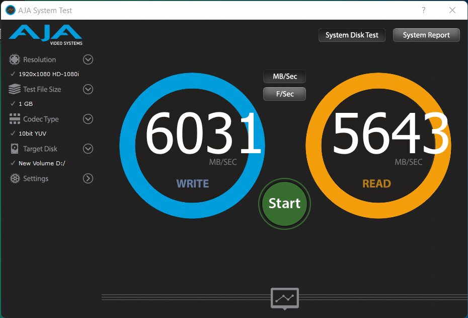 The AJA Video Systems Disk Test is relatively new to our testing and tests the transfer speed of video files with different resolutions and Codec.