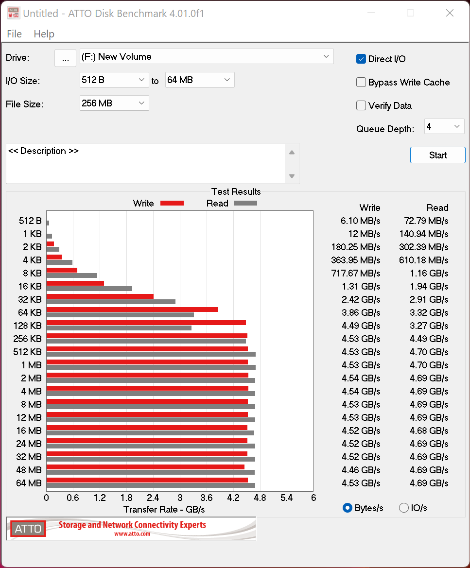 ATTO performance hits highs of 4.7GB/s read and 4.5GB/s write which are great considering listed specs are 5/4.5GB.