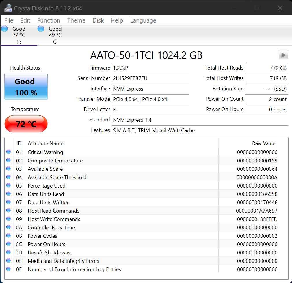Crystal Disk Info is a great tool for displaying the characteristics and health of storage devices. It displays everything from temperatures, the number of hours the device has been powered, and even to the extent of informing you of the firmware of the device.