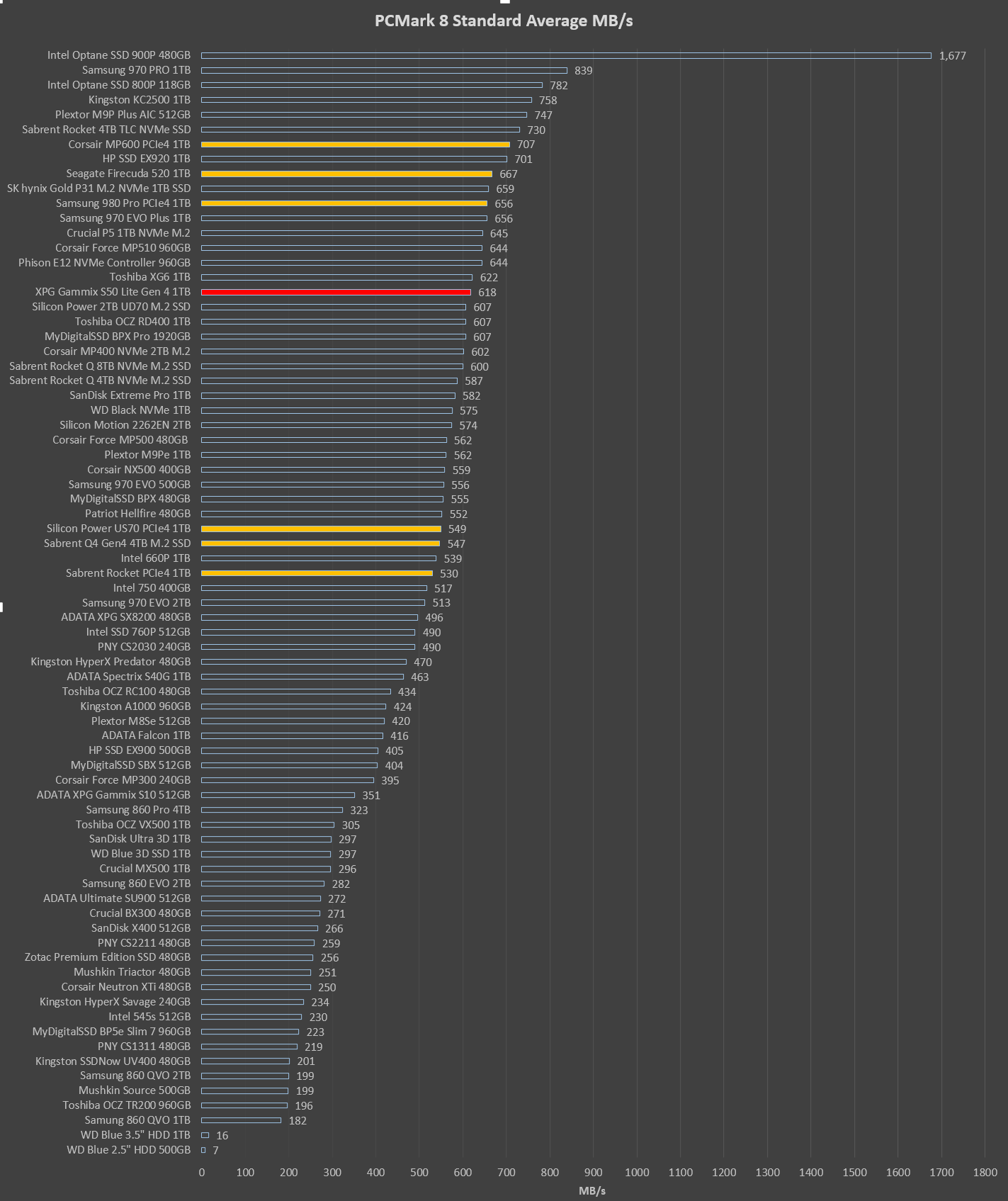Although the XPG Gammix S50 Lite NVMe SSD is not rated as one of the top performers with respect to its posted speeds, it did very well in this test, as we can see the comparison to other Gen 4 SSDs tested to date.