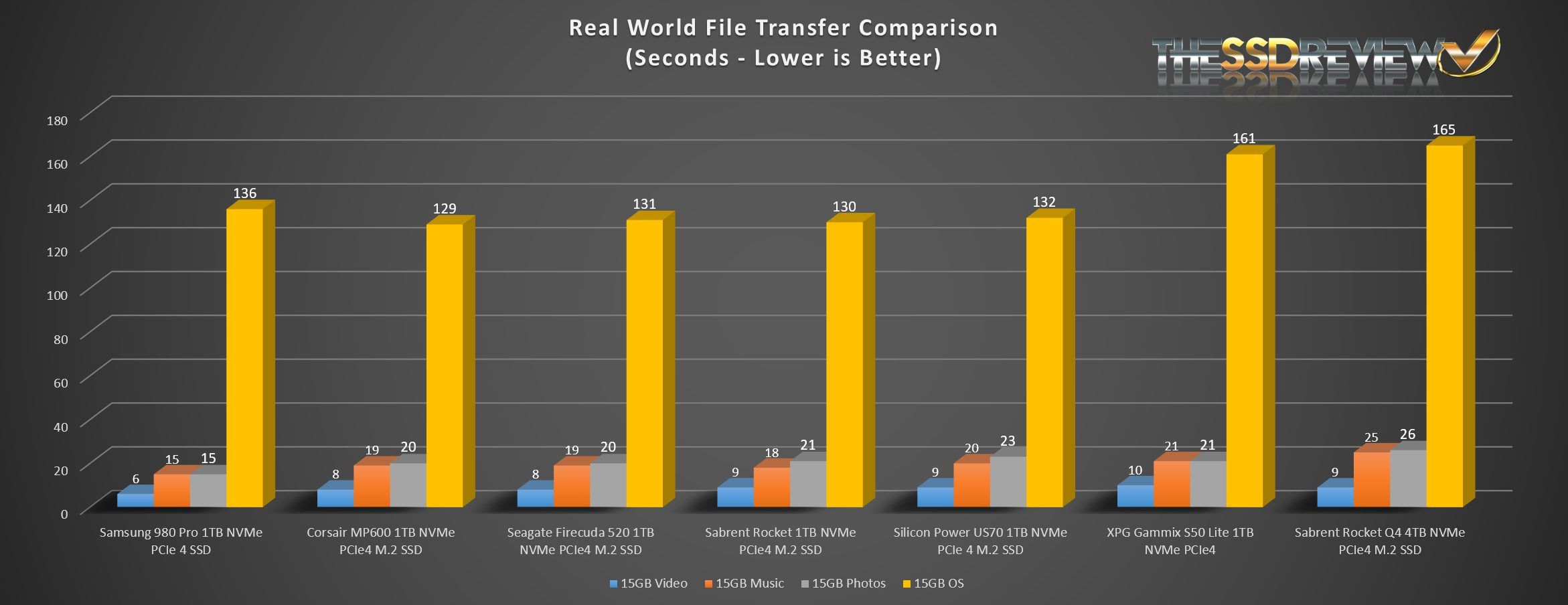 We have put the XPG Gammix S50 Lite NVMe SSD beside a few of the best PCIe 4.0 SSDs in the business for our true to life data testing. In this test, we simply place 15GB files representing music, video, pictures and operating systems onto the target drive. We then copy each file from one place on the target disk to another, recording the time taken for the transfer.