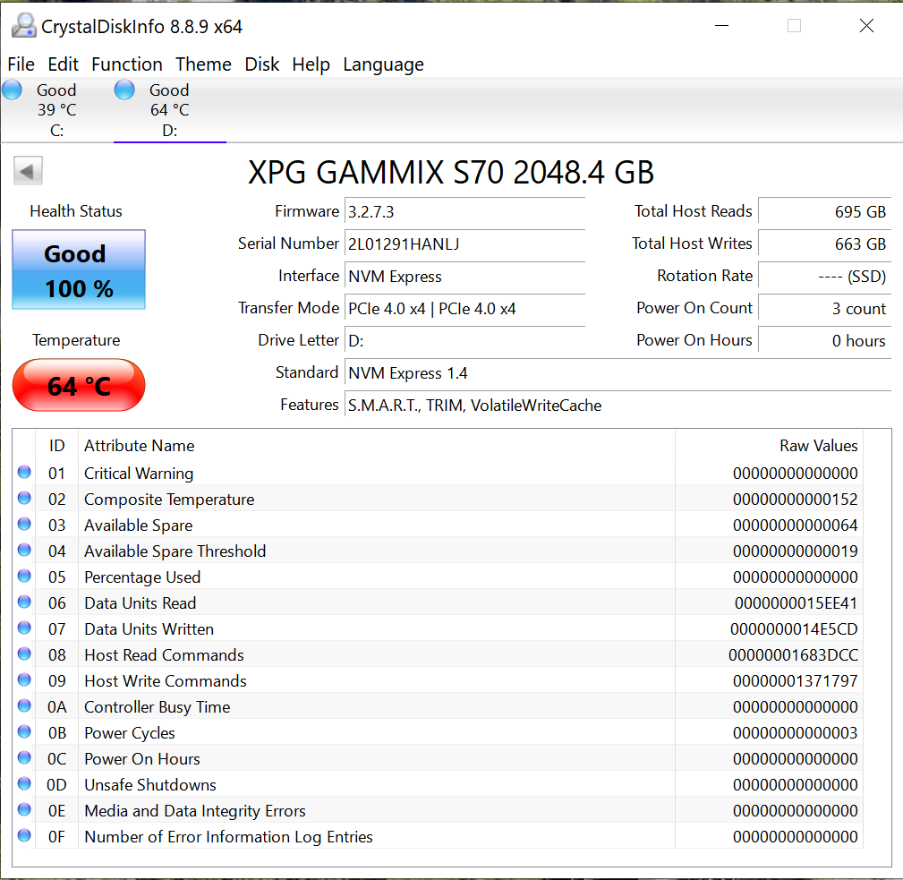 Crystal Disk Info is a great tool for displaying the characteristics and health of storage devices. It displays everything from temperatures, the number of hours the device has been powered, and even to the extent of informing you of the firmware of the device.