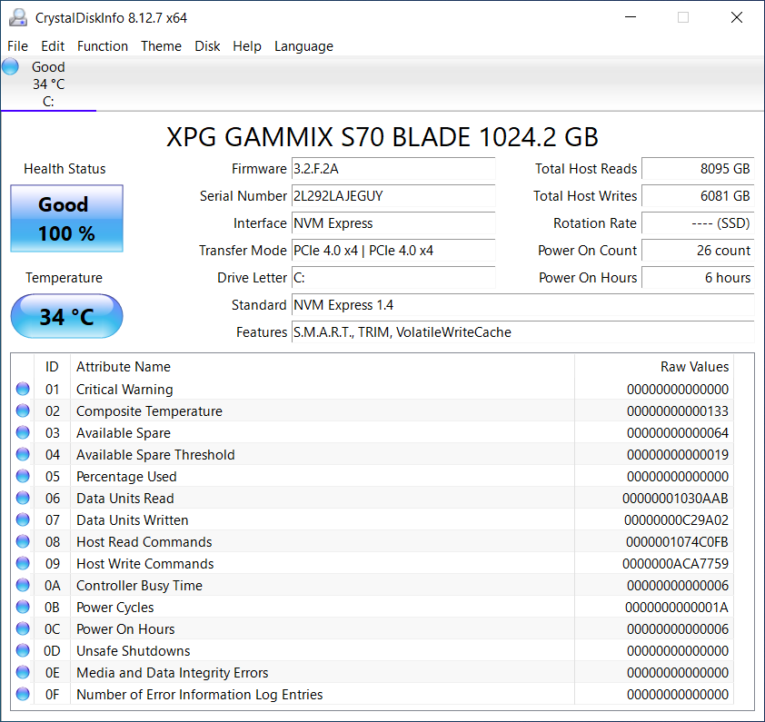 Crystal DiskInfo validates that our SSD is running in PCIe 4.0 x4, using the NVMe 1.4 protocol and confirms that it is TRIM capable. On the top right, we can see that we have put through more than 8TB in Total Host Read and 6TB in Total Host Writes. There is a reason.