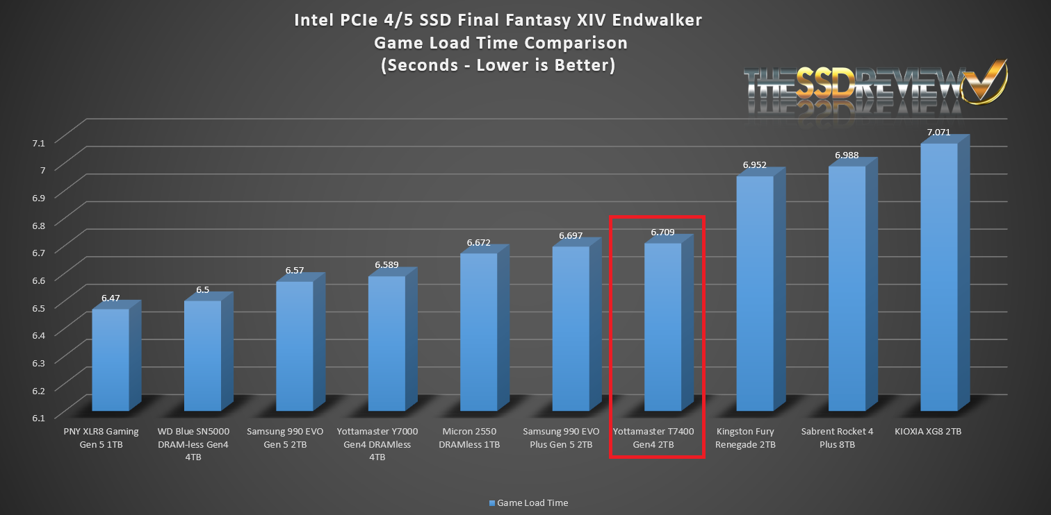 The Yottamaster T7400 placed well in game load time testing considering it is a mid-level SSD. It placed in exactly the halfway mark of just under 50 SSDs tested to date.