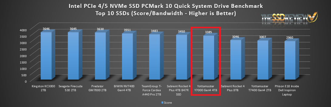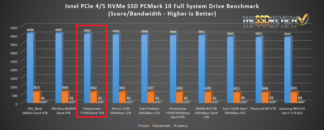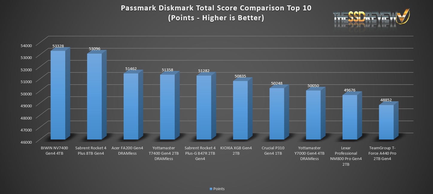 This chart does not depict where the Yottamaster T7400 Pro stand overall, but rather, displays where it stands in comparison to close rivals. By ratings this displays the mid-range to lower range of the charts and, once again, it is rather interesting that the four BIWIN manufactured SSDs are so close, considering we have reviewed so many. This is simply a slice of ten SSDs in a row.