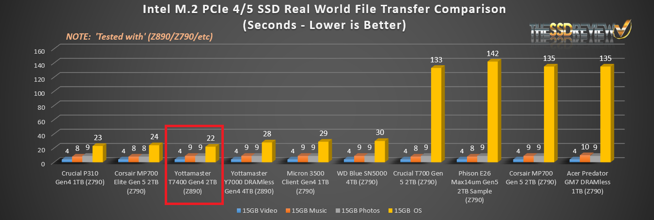 This is not a ranking, but rather, an example of how the T7400 placed amongst other SSDs. It’s also fair to note that we don’t include the timings of OS transfer in our final placement as OS data is affected significantly with different chipsets.