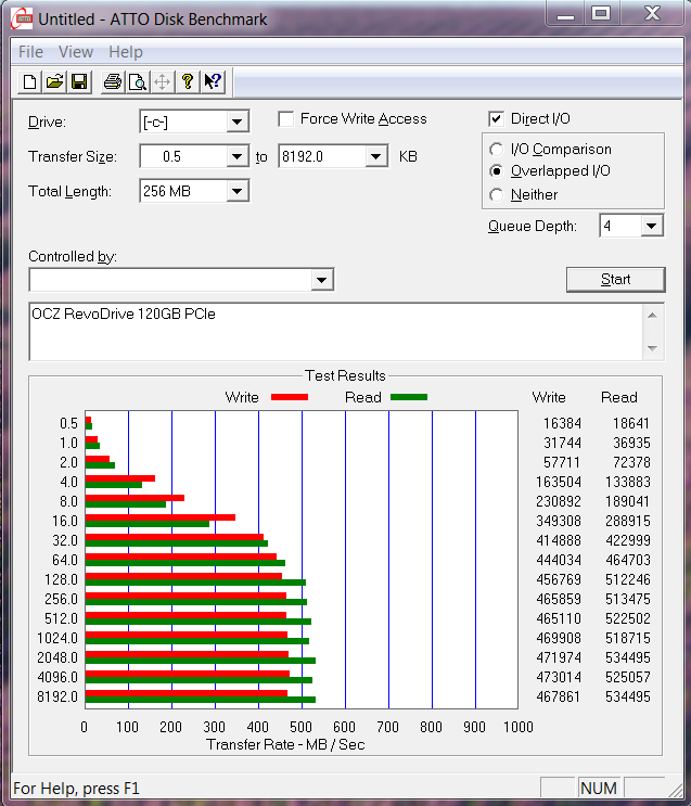 ATTO Disk Benchmark brought in high sequential read and write results of 534MB/s read and 473MB/s write which match right up with their listed specs.