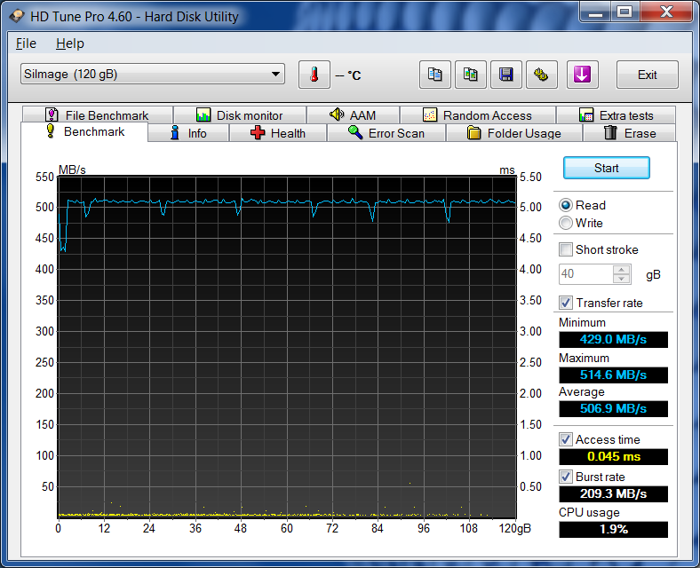 The key thing to notice about the HDTune Pro result is the access time of .045ms which, on a hard drive, might be a bit slower and around 9-10ms. Quite frankly, the difference between any solid state drive and a hard drive is about a 90x decrease in the access time of the SSD, or in this case PCIe which provides for the quicker boot times and near instant response in systems equipped with SSDs. It is almost like the computer knows what program you are about to start before you actually hit the key.
