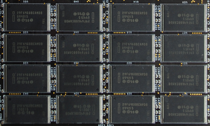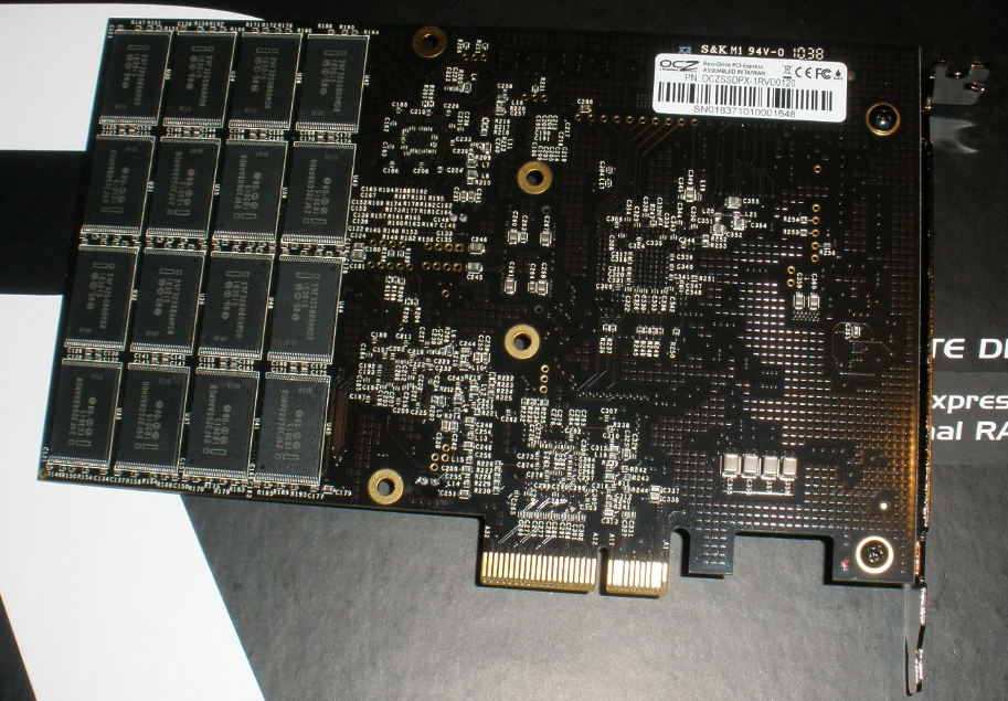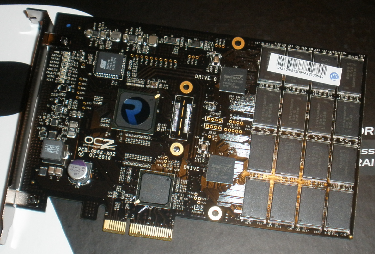 If we take a look at the card itself, we find out that there are a few more components than the typical solid state drive. The first thing we noted right off was the two SandForce SF-1200 processors which falls into the working principle that we discussed with respect to RAID 0 earlier. On either side of the card, there are also 16x4GB Intel NAND flash memory chips which brings the total to 2x64GB or 128GB of NAND storage.