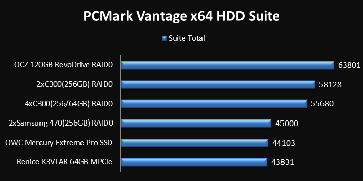 The Vantage HDD Suite final score is determined through the transfer speeds of the eight separate tests provided. As you can see, even with comparison testing of top SSDs using Intels newest drivers in ICH10RAID, the OCZ RevoDrive comes out on top in PCMark Vantage x64 testing. The score that the PCZ RevoDrive PCIe has produced is our top to date. I wonder how much better the Revo x2 would be (hint…hint).