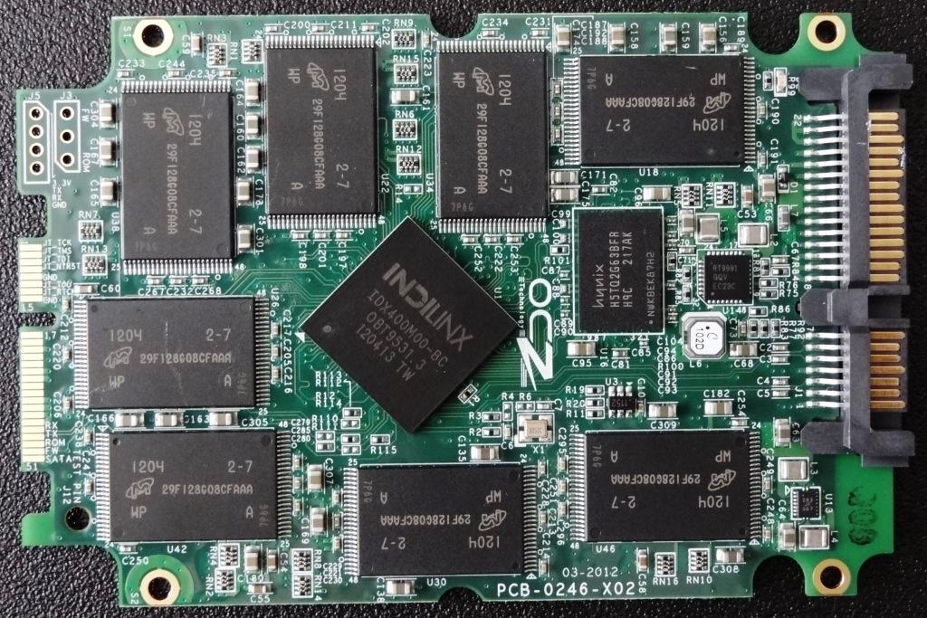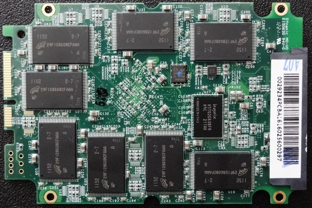 Once disassembled we get a look at the PCB with the Indilinx Everest 2 IDX400M00-BC controller, two Hynix DDR3 256MB DRAM cache modules and 16 pieces of Micron 25nm Asynchronous multi-level cell (mlc) NAND flash memory.