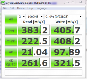 AS SSD doesn’t display anything unique with respect to transfer speed, however, the write Access Time of .032ms is very quick and the equal high 4k-64Thrd IOPS read and write results are also not seen often. The overall point score of 861 is above average but not the highest we have seen to date, with some SSDs breaking the 1000 point mark.