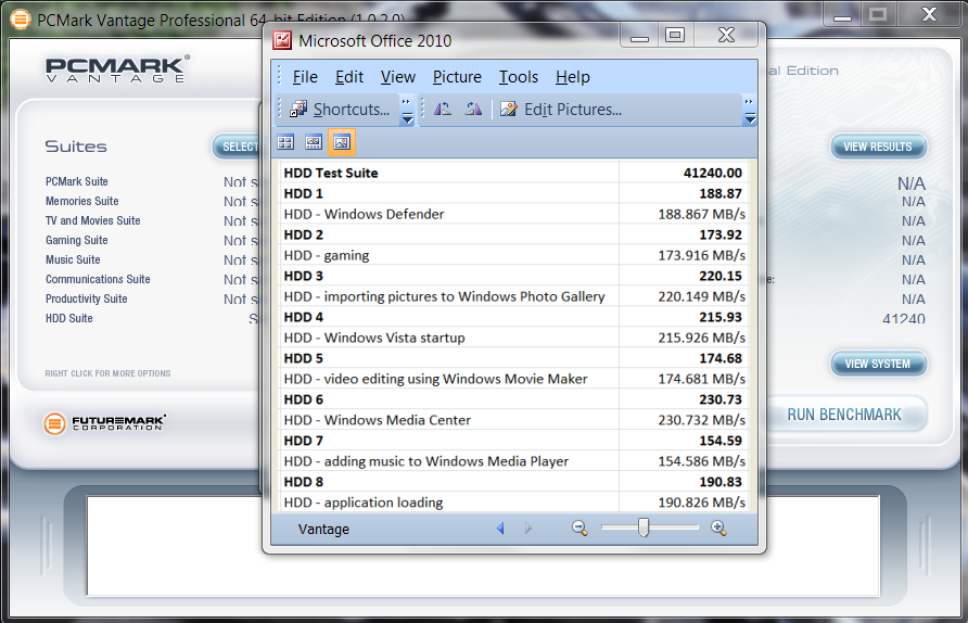 The SSD Review uses benchmark software called PCMark Vantage x64 HDD Suite to create testing scenarios that might be used in the typical user experience. There are eight tests in all and the tests performed record the speed of data movement in MB/s to which they are then given a numerical score after all of the tests are complete. The simulations are as follows:
