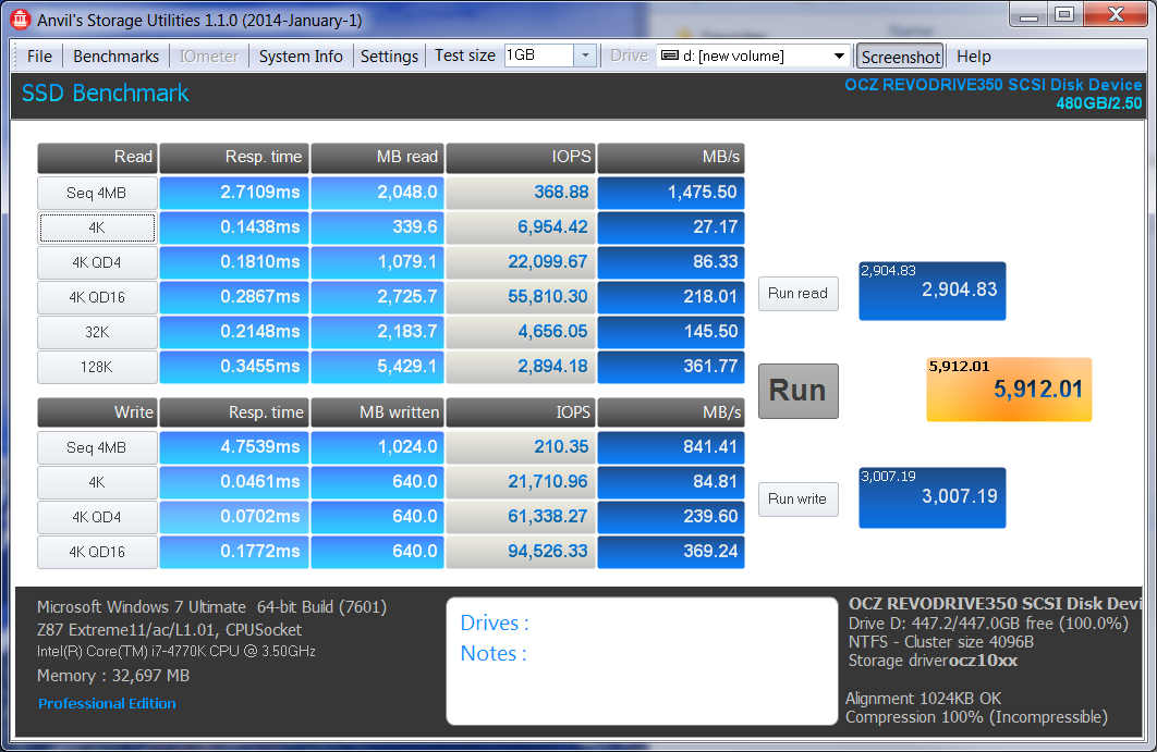 Anvil Storage Utilities (ASU) are the most complete test bed available for the solid state drive today. The benchmark displays test results for, not only throughput but also, IOPS and Disk Access Times. Not only does it have a preset SSD benchmark, but also, it has included such things as endurance testing and threaded I/O read, write and mixed tests, all of which are very simple to understand and use in our benchmark testing.